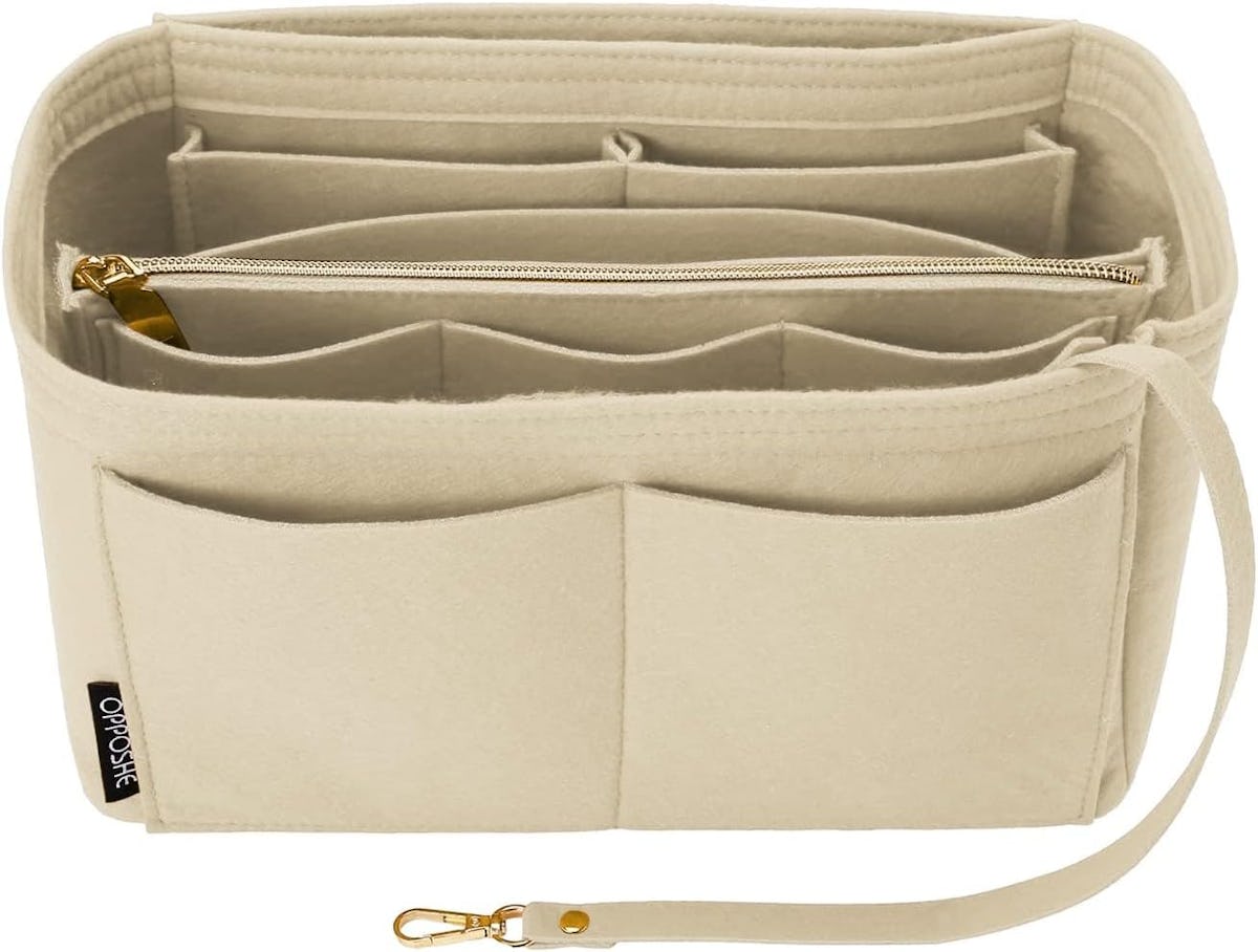 Easily organize your purse with this felt insert. It has 14 compartments to stash everything from your phone and sunglasses to your wallet, pens, and more. It even has a zipper pocket and key leash for extra security. The insert is designed for all kinds of tote-style bags like those from Goyard, Longchamp, Kate Spade, and more.