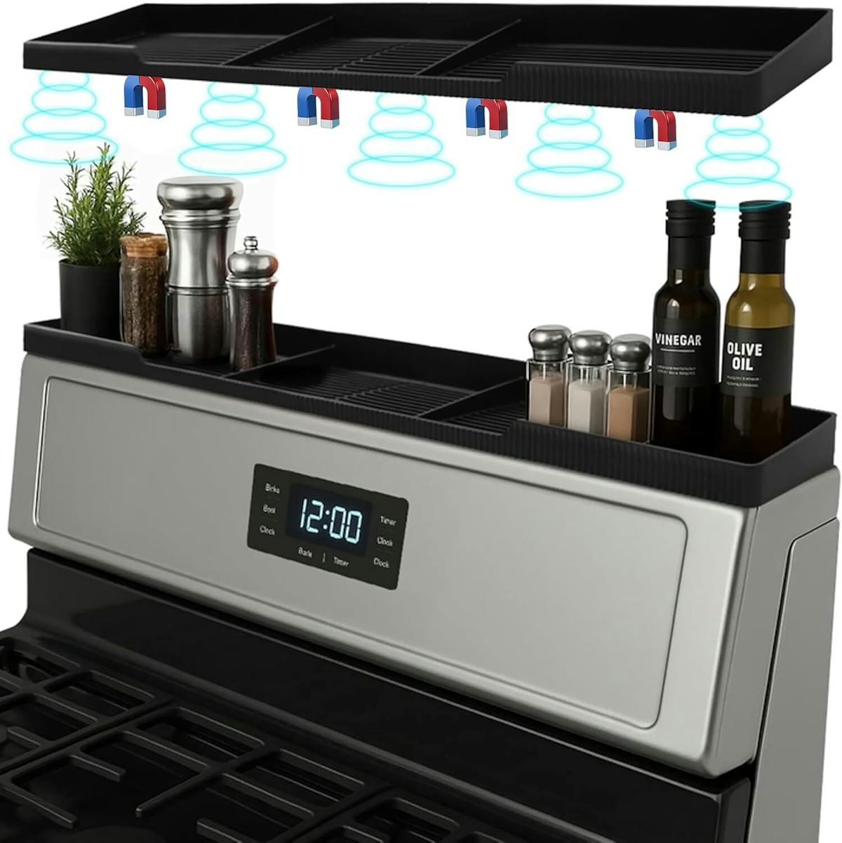 Utilize the top of your stove for storage with this magnetic shelf; it’s ideal for often-used items like spices, oils, cooking spray, and more. The shelf features various compartments to organize everything, and it’s made from heat-resistant silicone that won’t warp or melt.