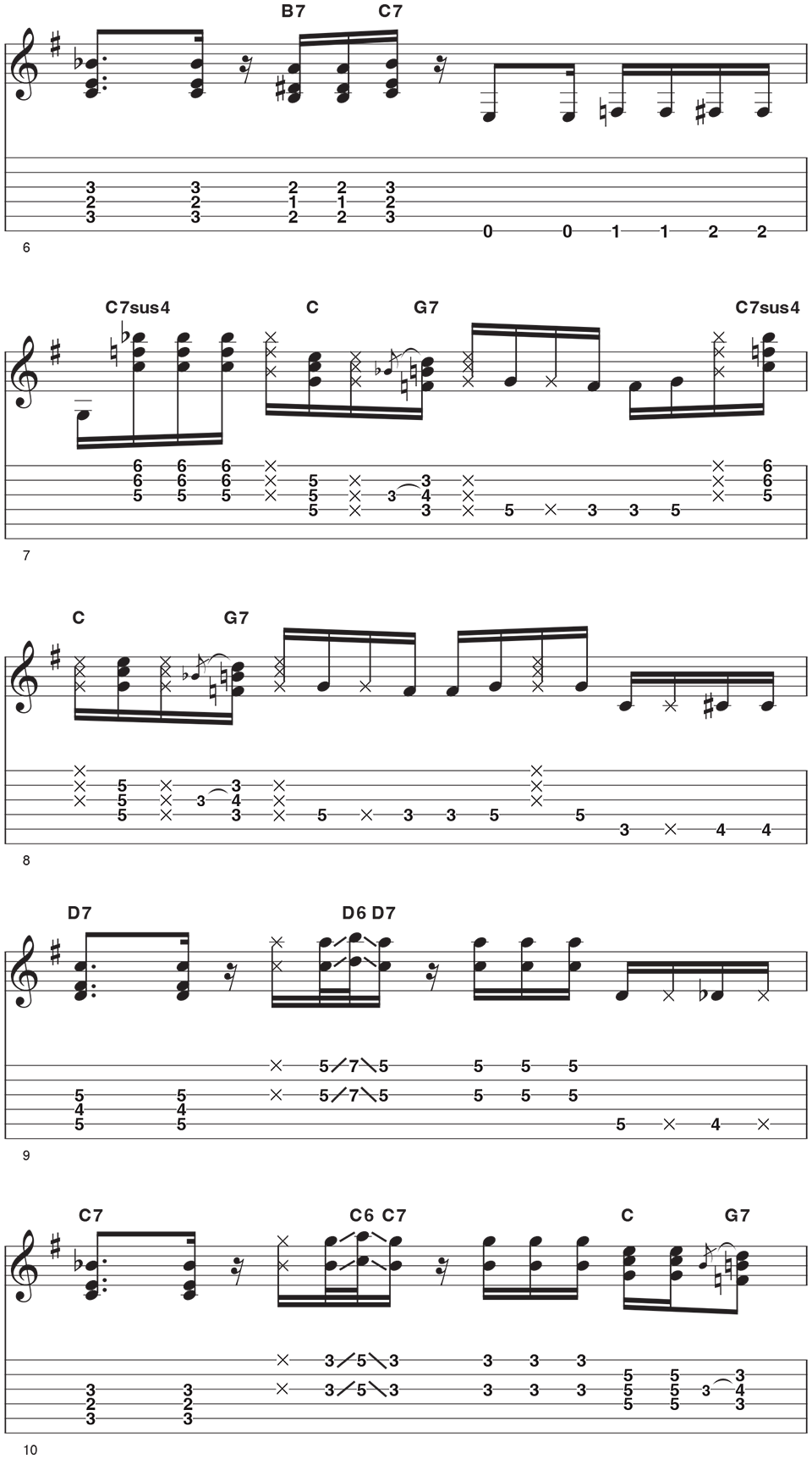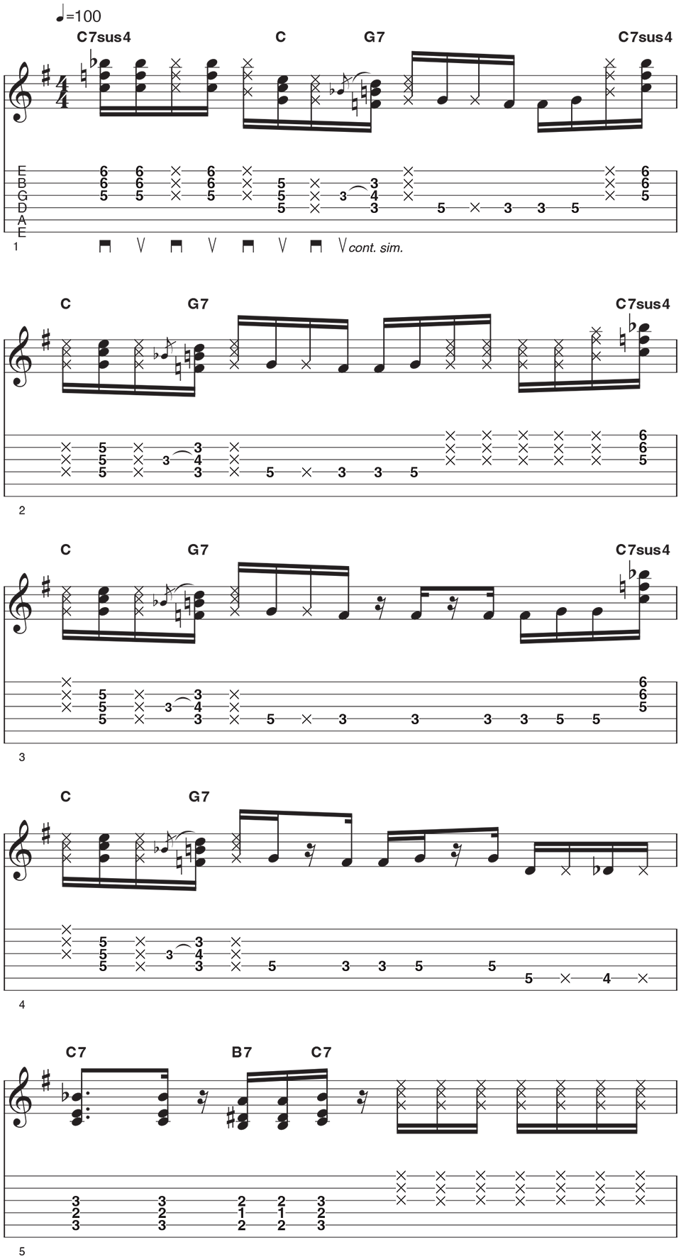 For bars 1-4, a G7 based chord riff is played using fragments of C7sus4 and C before resolving to a G7, complete with a quick bluesy hammer-on from Bb to B. The 16th note strumming is played with constant down and up strums while muted strings and chords are created by the fretting hand. You will notice that no bar has the same playing in it, with small variations each time that create excitement and variety.