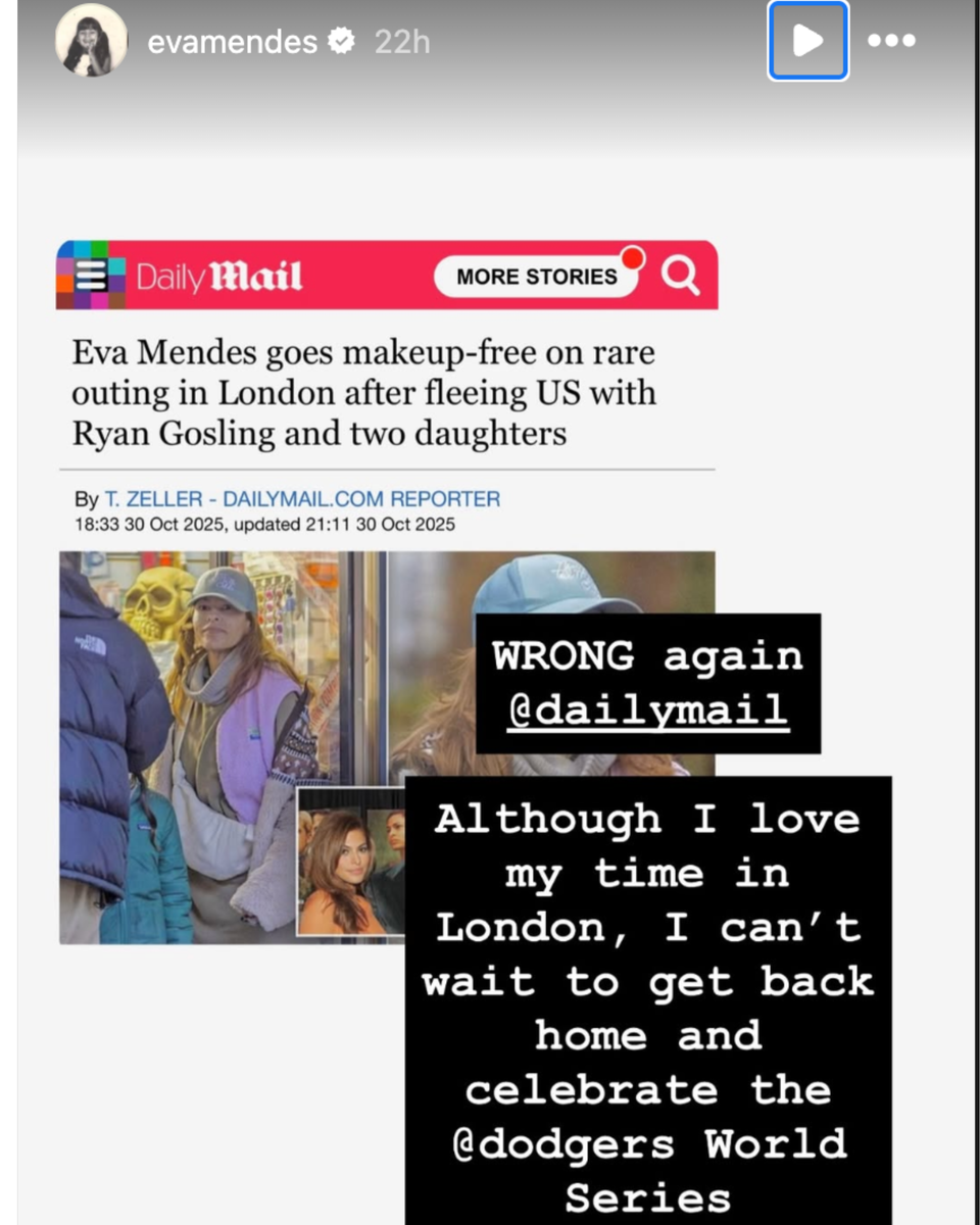 Mendes shut down rumors that she and Gosling had relocated to London with their two daughters. In a November 3 Instagram Story, the actress reposted a screenshot of a Daily Mail article and wrote, “WRONG again @dailymail. Although I love my time in London, I can’t wait to get back home and celebrate the @dodgers World Series championship!” She added, “Go Dodgers!!!”