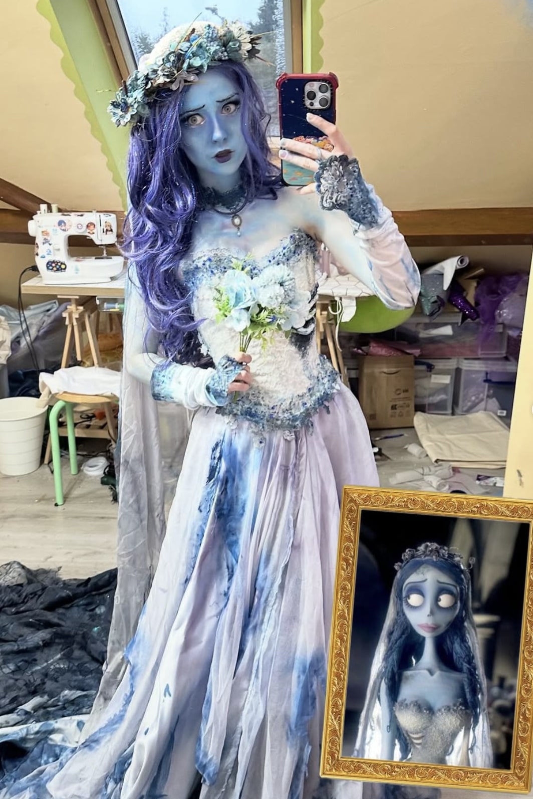 The designer masterfully recreated the iconic Corpse Bride from Tim Burton’s animated film. She wears a ghostly wedding dress in blue-gray gradient tulle with a bodice adorned with pearls and sparkling crystals that capture the character’s ethereal appearance. The torn sleeves and wispy veil add to the characteristic ghostly effect. Her long, wavy blue wig, paired with the crown of white and blue flowers, faithfully replicates Emily’s romantic hairstyle. The blue body paint and corpse-like makeup with gray lips and dark outlines around the eyes create the signature spectral appearance. Delicate jewelry and vintage accessories complete this striking transformation of the most touching dead bride in animated cinema.