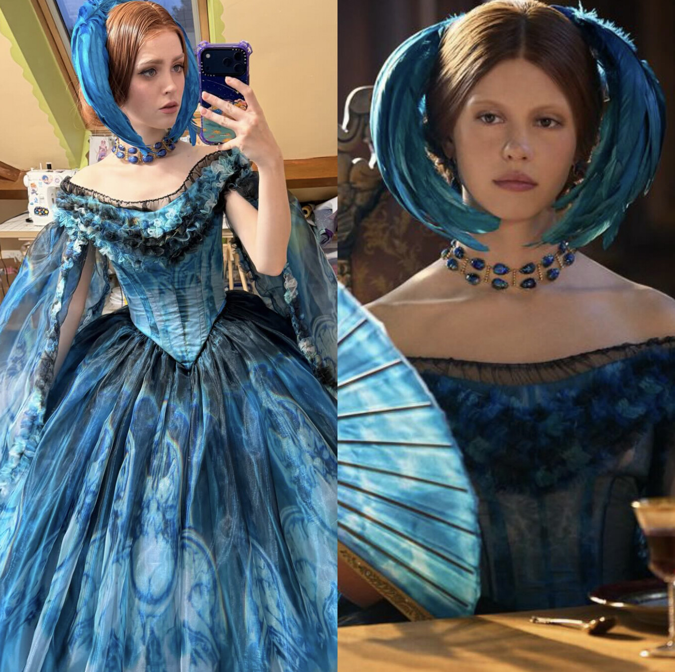 Rosie has meticulously recreated Lady Elizabeth Harlander’s sumptuous outfit from the 2025 film “Frankenstein.” This spectacular Victorian gown features a structured turquoise blue bodice with a Bardot neckline adorned with black lace and sophisticated pleated ruffles. The voluminous crinoline skirt features swirling patterns in shades of blue, creating a striking visual effect. The most striking element is the imposing circular blue headpiece framing the face, perfectly matched with the blue and black gemstone necklace. The refined makeup in natural tones highlights her delicate features. This stunning transformation captures the eccentric and gothic essence of the film’s period character.