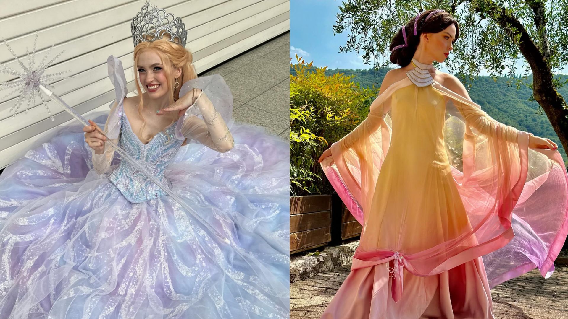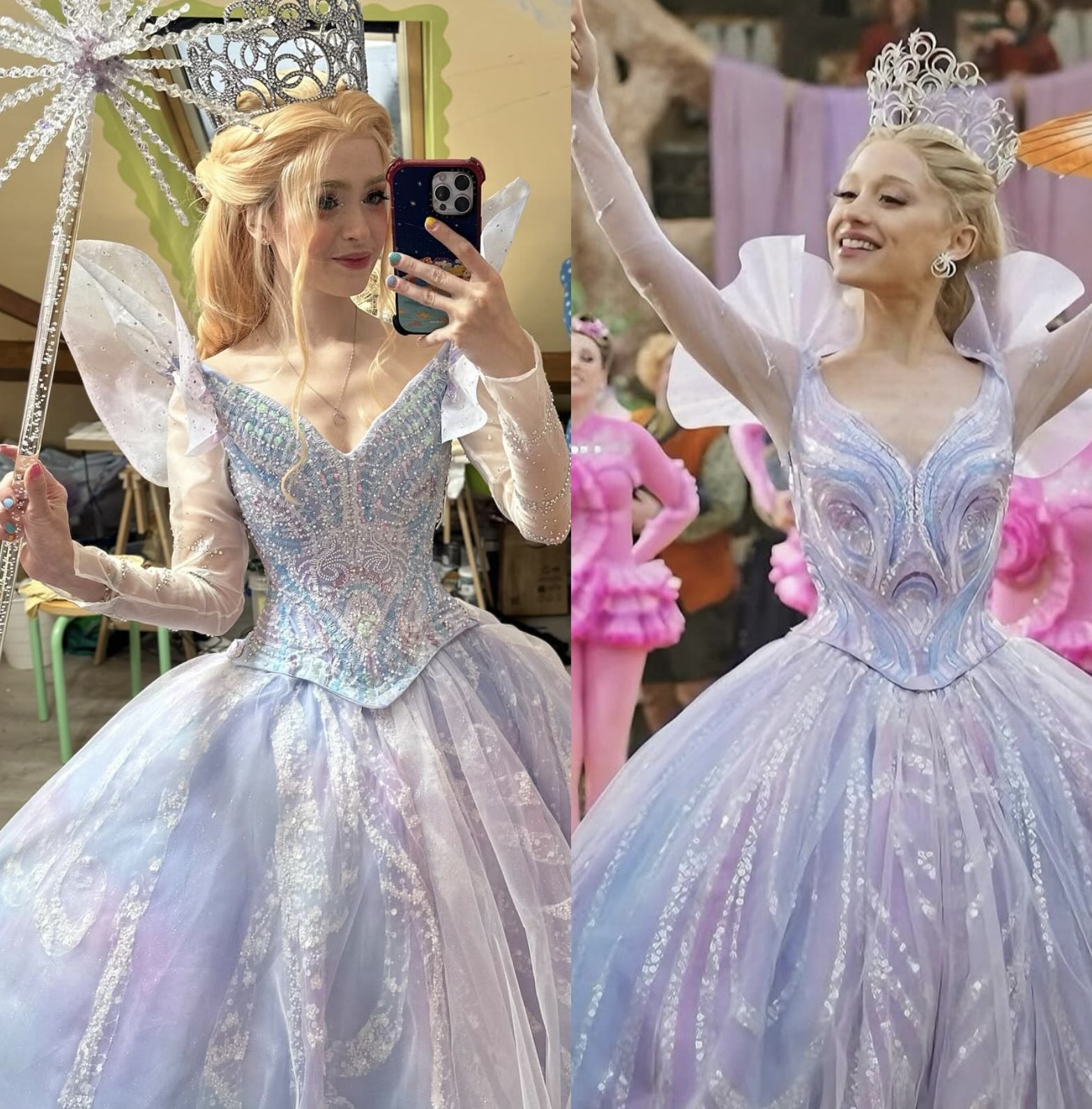 Rosie has recreated the iconic look of Glinda the Good Witch from the movie Wicked with stunning precision. The centerpiece is a spectacular puffed dress with generous volumes, composed of multiple layers of iridescent tulle mixing sky blue, lavender, and pearly white, sprinkled with sequins and sparkling silver threads. The corset-style bodice, embroidered with blue and turquoise sequins, is remarkably delicate. The long sleeves in transparent tulle reveal the arms while maintaining the ethereal appearance of the character. The imposing silver filigree crown and magic wand adorned with a crystal star complete the ensemble with perfect visual coherence.