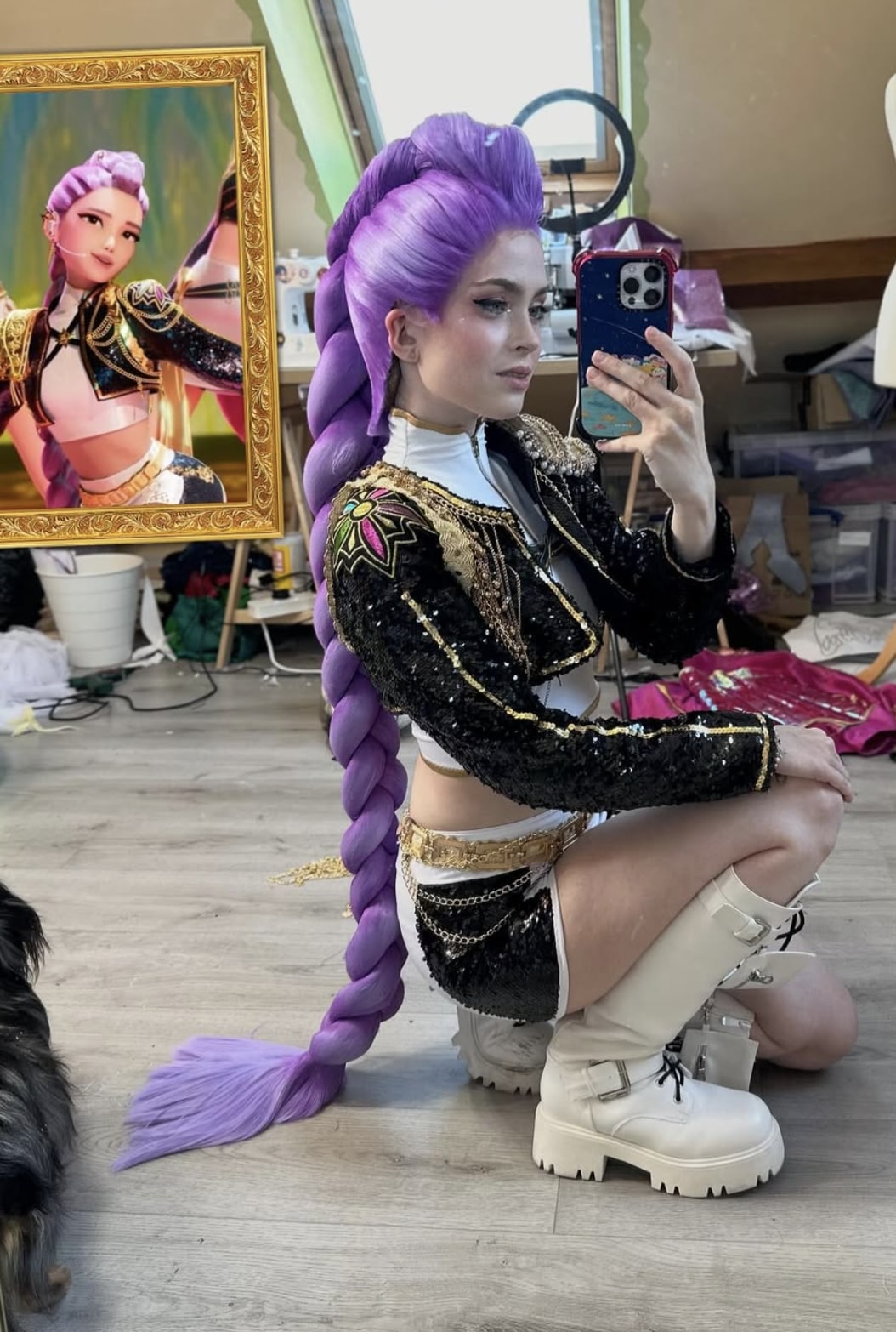 The artist brilliantly captured the futuristic and bold aesthetic of Rumi from “K-pop Demon Hunters.” The white two-piece outfit with a short crop top and tight shorts creates a modern and dynamic silhouette. The black sequined jacket with sparkling gold geometric details and structured shoulder pads adds a spectacular dimension worthy of a K-pop performance. The purple wig styled in a high, voluminous ponytail perfectly embodies the character’s vibrant style. The white lace-up boots and ornate gold belt with dangling chains complete the stylish demon hunter look. The dramatic makeup with accentuated false eyelashes captures the electrifying energy of this character from the Korean fantasy universe.