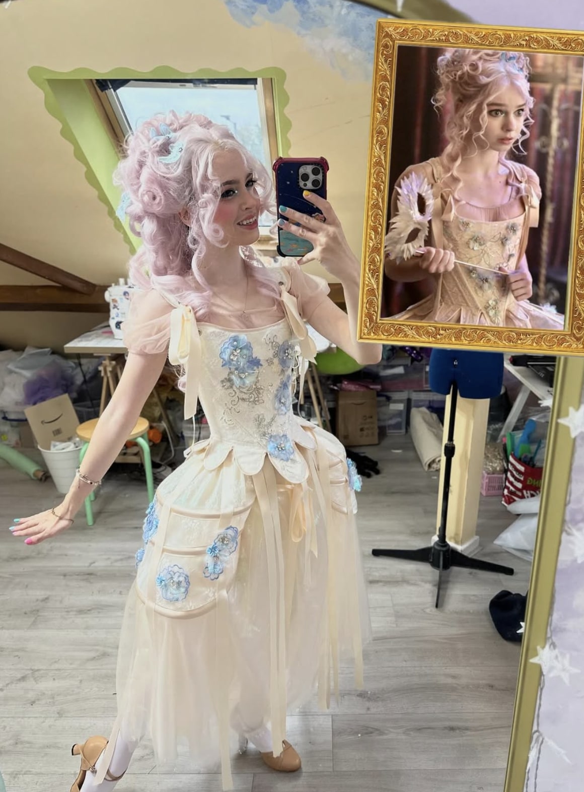 This cosplayer has brilliantly recreated the look of Enid Sinclair from the Netflix series “Wednesday.” She wears a pastel pink dress typical of the Regency period with blue floral appliqué details, faithful to the character’s kawaii and colorful style. The pastel pink wig, curled into a high bun with strands framing the face, perfectly captures the period hairstyle of the ball. The soft and luminous makeup reflects Enid’s playful personality. The puffed sleeves, fitted bodice, and layered ruffled skirt accurately reproduce the silhouette of the Rave’N Ball costume from the series, creating an impressive transformation of this endearing character.