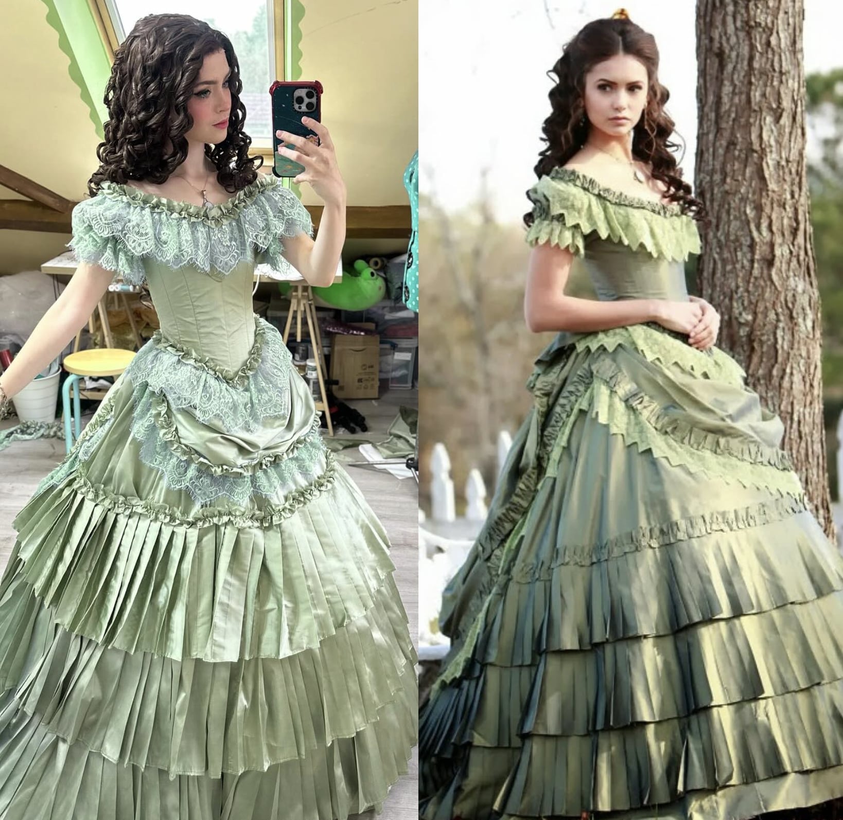 This recreation of Katherine Pierce from “The Vampire Diaries” is spectacular. The cosplayer wears a magnificent sage green period dress with multiple layered ruffles, typical of the Victorian style of the 19th century. The fitted bodice adorned with lace and bare shoulders capture the sensual elegance of the character. The brown wig with long, structured curls replicates Katherine’s historical hairstyle in flashbacks. Refined details such as the gathers, the drape of the skirt, and the decorative bows demonstrate meticulous workmanship. The sophisticated makeup and confident expression perfectly embody the attitude of this manipulative and seductive vampire.