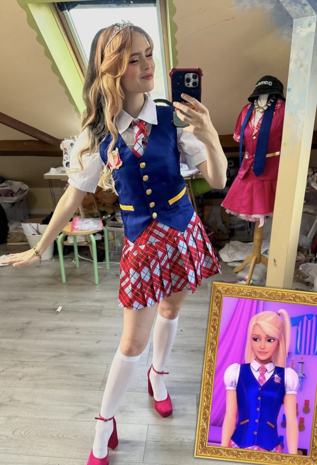 The artist has perfectly recreated Blair Willows’ distinctive school uniform from the animated film “Barbie: Princess Charm School.” She wears the iconic academic outfit consisting of a white collared shirt with puffed ruffled sleeves, a fitted navy blue vest adorned with gold buttons and yellow details on the pockets. The red and white checkered tie adds a characteristic preppy touch. The short pleated skirt with a red, white, and blue tartan pattern completes the royal academy uniform. The white knee-high socks and red Mary Jane shoes faithfully reproduce the student look. Her wavy blonde wig with a delicate tiara captures Blair’s transformation. This detailed recreation embodies the refined elegance of the charming school where young girls learn to become princesses.