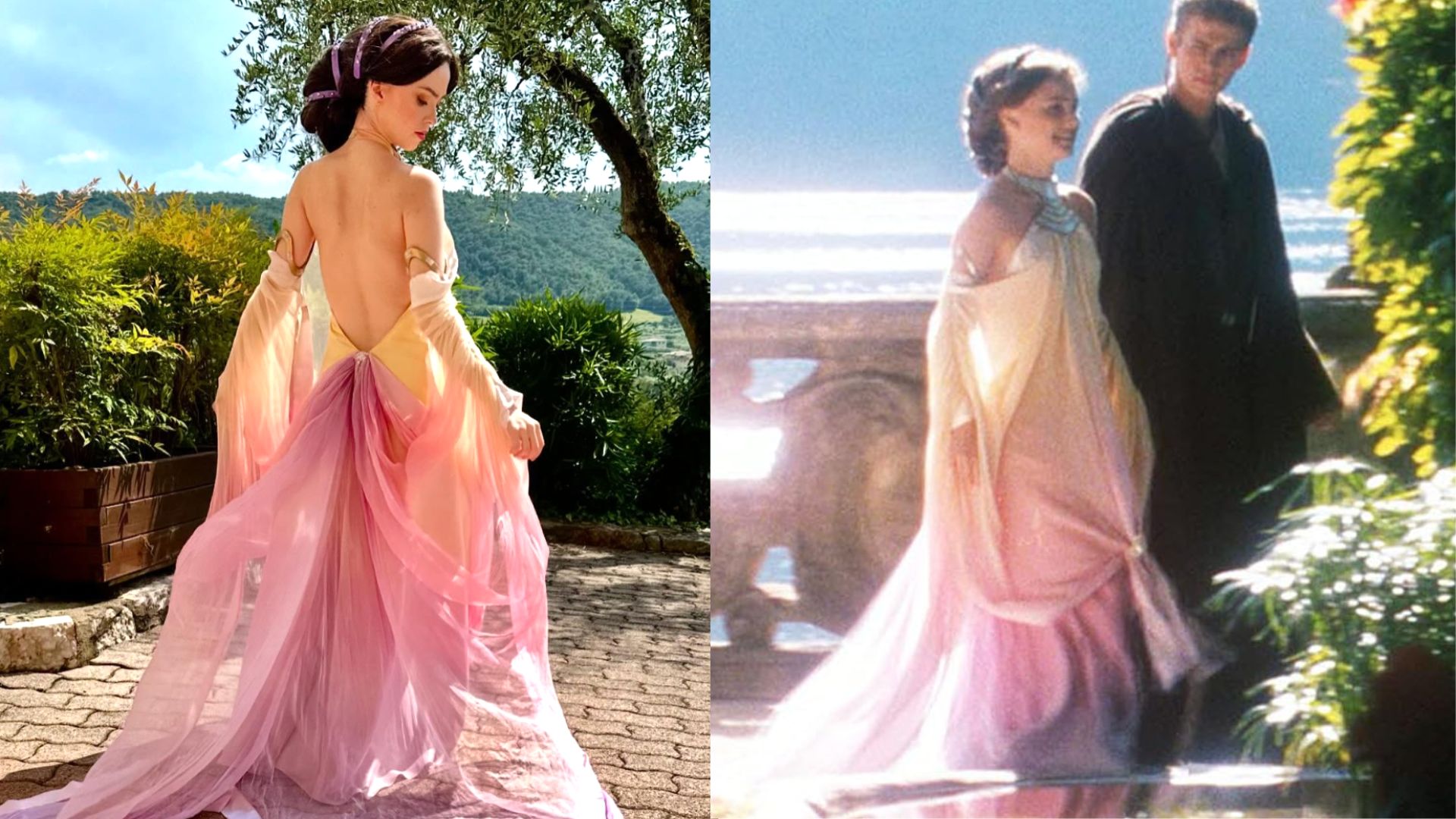 The designer has beautifully recreated one of Padmé Amidala’s most romantic outfits from “Star Wars: Attack of the Clones.” This dress features a gorgeous ombré gradient ranging from peachy cream to lilac pink, creating a dreamy and ethereal effect. The spectacular open back and flowing sleeves in lightweight chiffon perfectly capture the elegance of the scene on Naboo. The flowing skirt with its long train that unfurls majestically replicates the graceful movement of the original costume. Her brown hair is styled in a low bun with wavy strands, reflecting Padmé’s signature style. This recreation captures the romantic and delicate essence of the character in one of her most memorable moments.