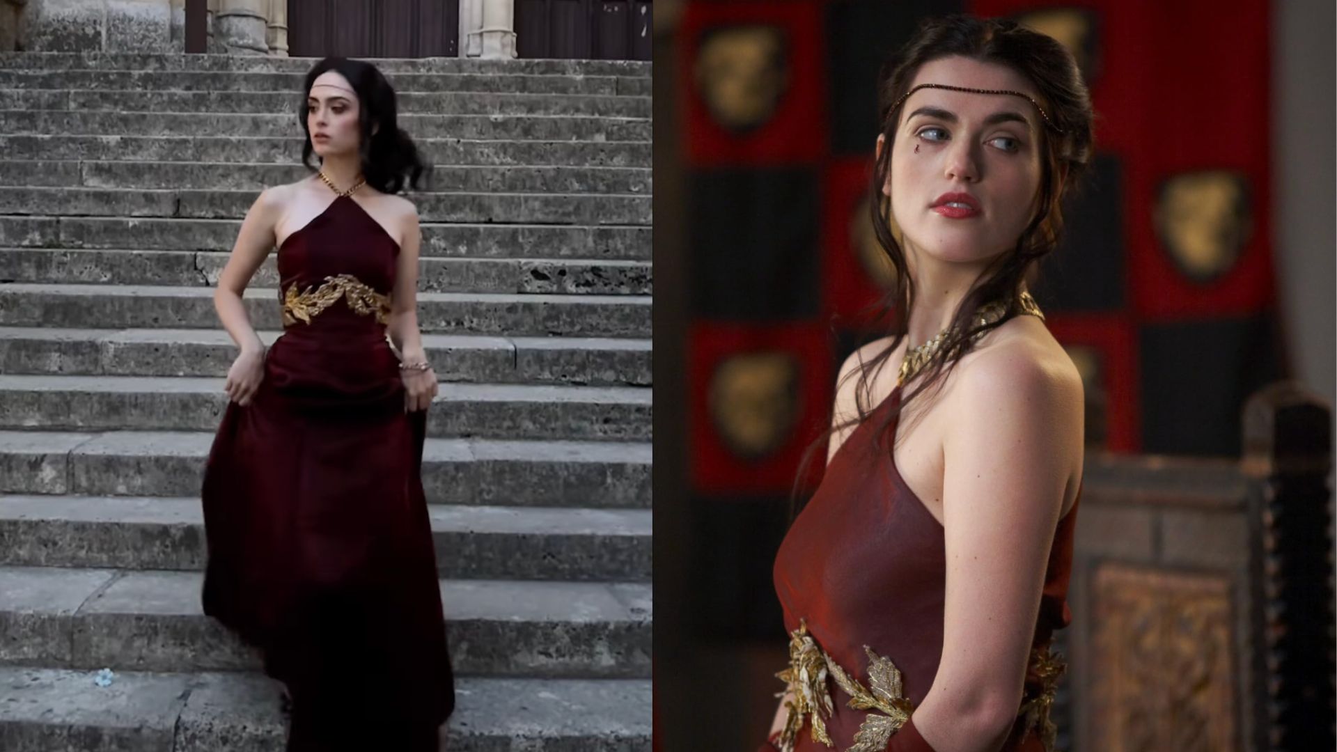 The cosplayer has beautifully recreated Morgana Pendragon from the series “Merlin.” She wears an elegant burgundy antique Greek dress with an asymmetrical neckline tied at the shoulder, reflecting the medieval-fantasy style of Camelot. The ornate golden belt in the shape of laurel leaves at the waist adds a royal and magical touch characteristic of the high priestess. Her black wig with soft, loose curls and the braided headband at the front reproduce the character’s romantic hairstyle. The chunky Celtic-style gold necklace completes the mystical look. The dramatic makeup with dark smoky eyes and deep lipstick intensifies the look and emphasizes the character’s dark and bewitching nature. This transformation perfectly captures Morgana’s dangerous beauty and mysterious power in this legendary Arthurian series.