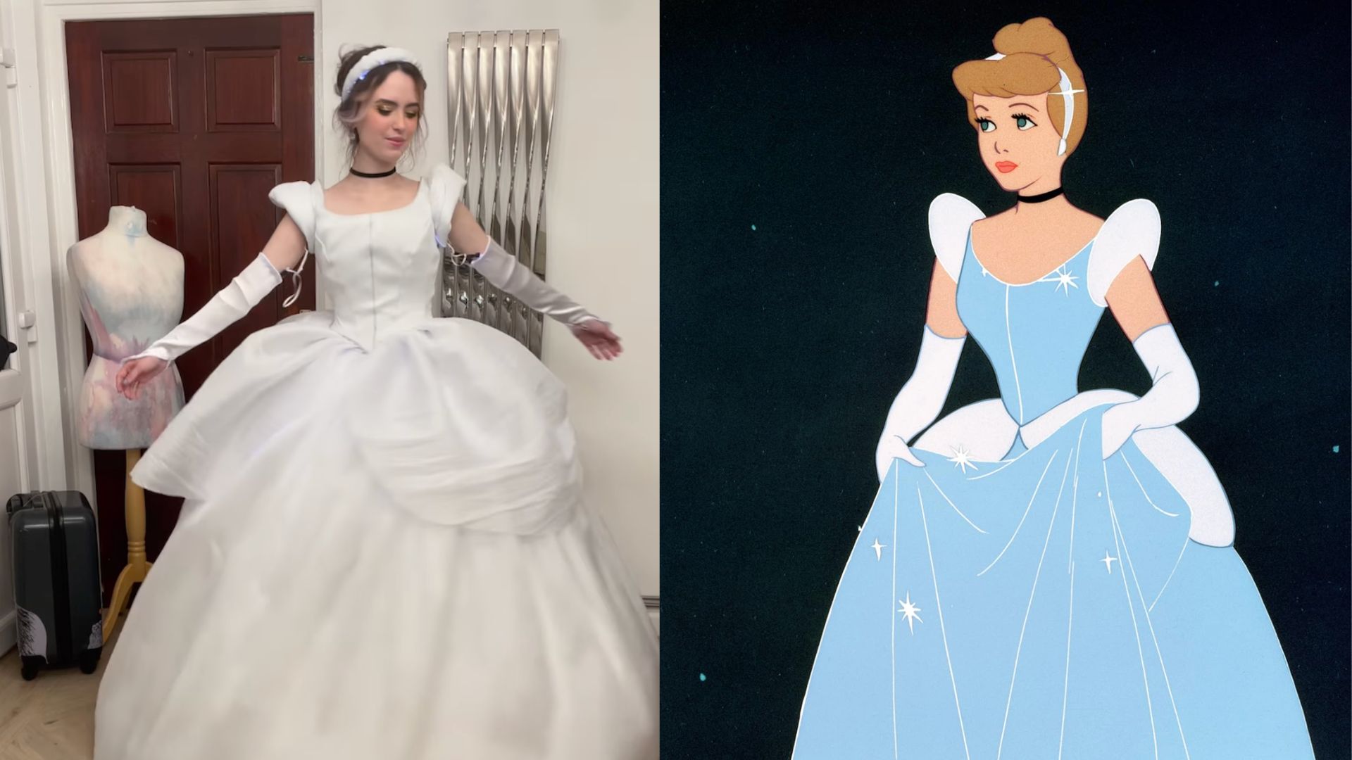 The cosplayer has created a magnificent version of Cinderella celebrating the 75th anniversary of the Disney classic. She wears a sumptuous immaculate white ball gown with a voluminous puffy tulle skirt that creates the iconic princess silhouette. The fitted bodice with delicate short sleeves and a square neckline replicates the character’s timeless elegance. Long black satin gloves add a touch of sophistication and glamour. Her blonde wig, styled in a high bun adorned with a black headband, captures Cinderella’s elegant hairstyle at the royal ball. The dress is made of fiber optic fabric, creating a magical luminous effect. This stunning transformation captures the grace and fairy-tale beauty of the most famous glass slipper transformation in animated cinema.