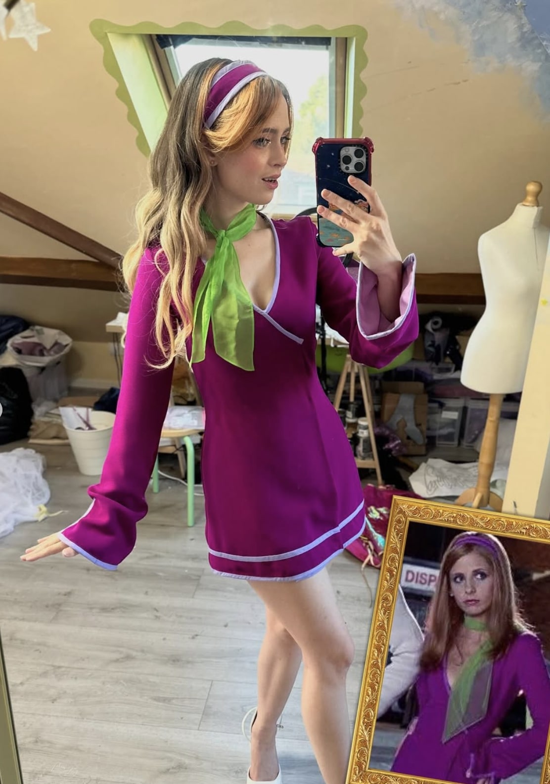 Cosplayer Rosie perfectly captured the essence of Daphne Blake from Scooby-Doo with her short magenta purple dress with long sleeves and distinctive V-neckline. The matching headband in her wavy red hair and the green scarf tied around her neck are iconic accessories that have been faithfully reproduced. The white trim on the dress adds a distinctive detail to the classic costume. Her dynamic pose evokes a modern spirit while honoring the retro look of the 1970s. Natural makeup and wavy red hair complete this successful transformation of the mysterious and glamorous character from the cult animated series.