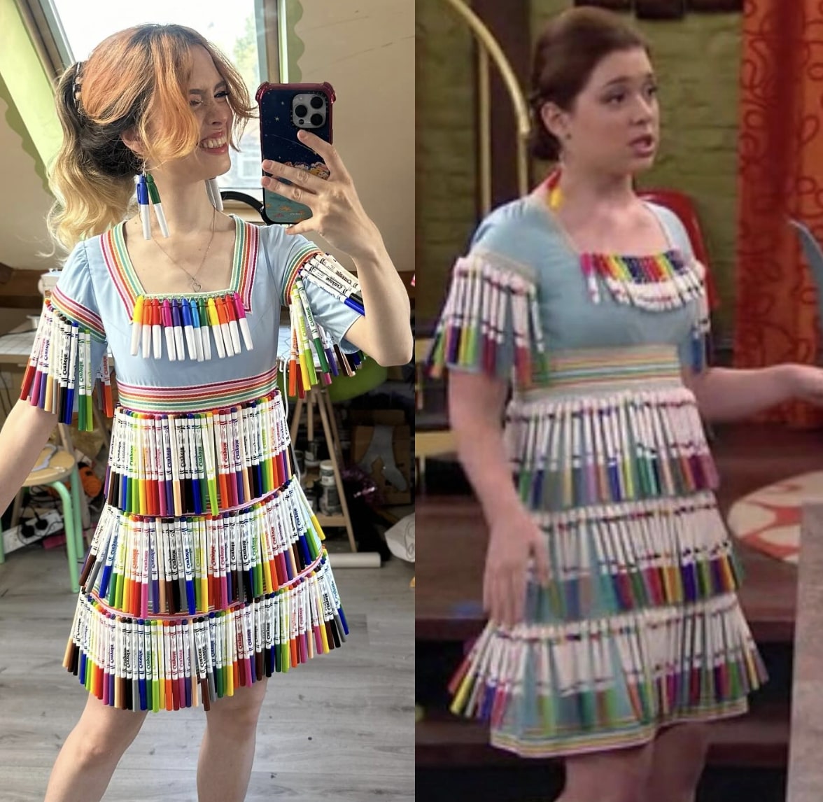 The cosplayer perfectly captured the eccentric and colorful style of Harper Finkle from “Wizards of Waverly Place.” She wears an extraordinary dress made entirely of colored pencils assembled together, creating a vibrant rainbow pattern and unique texture typical of the character’s original and eccentric creations. This impressive craftsmanship reflects Harper’s boundless imagination and unconventional fashion sense. The style, with a fitted silhouette and short flared skirt, highlights this innovative construction. Her red wig, styled in two low buns with strands framing her face, replicates one of Harper’s signature hairstyles. White pearls as accessories and white wedge heels complete the quirky, fashionista look. This recreation perfectly captures the creative spirit and sartorial daring of Alex Russo’s zany best friend.