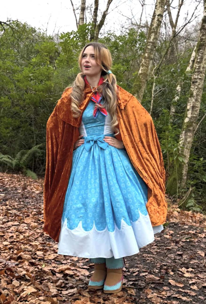 Rosie has beautifully recreated Anastasia Romanov’s iconic look from the animated film. She wears an elegant black strapless evening gown with a fitted, streamlined silhouette, faithful to the character’s 1920s style. The spectacular translucent blue cape that floats behind her perfectly replicates the dramatic effect of the ball scene. Her red wig, styled in a chignon with strands delicately framing her face, captures Anastasia’s elegant hairstyle. The sparkling diamond necklace and long satin gold gloves add a touch of royal sophistication. Soft makeup with pink lips completes this graceful transformation of Russia’s lost princess in all her aristocratic splendor.